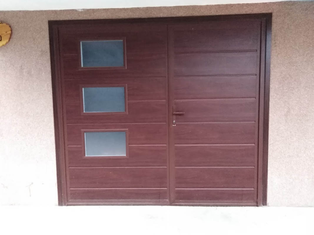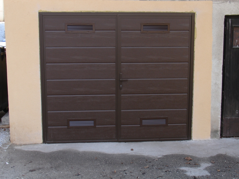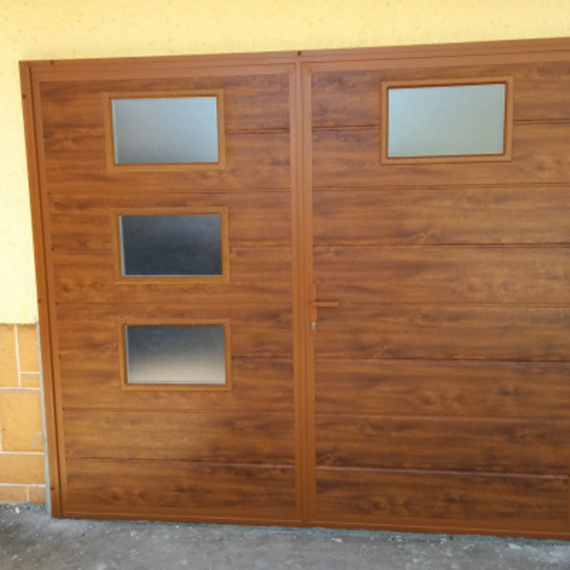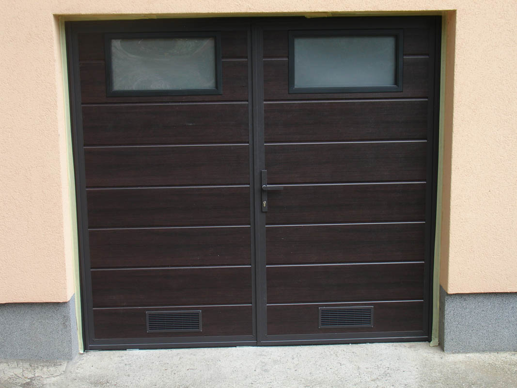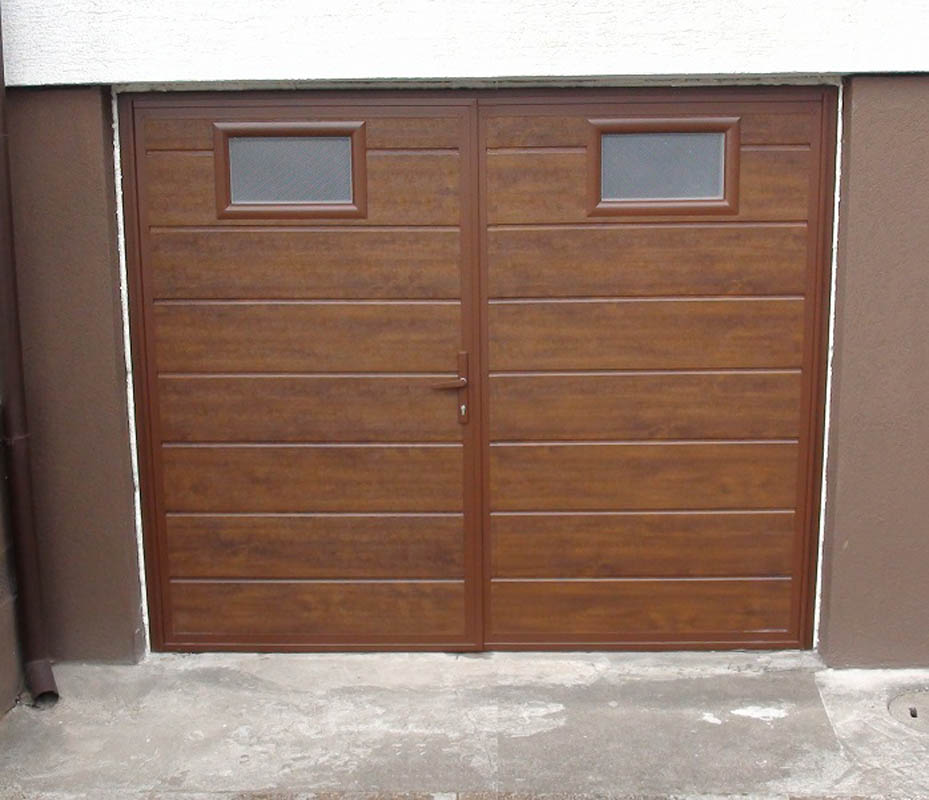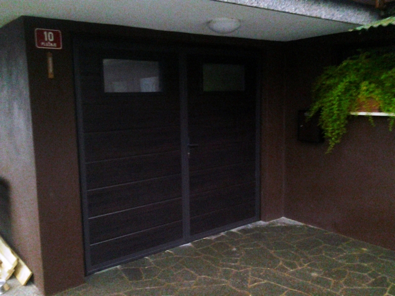 Izdelujemo dvokrilna klasična garažna vrata. Da zaokrožimo ponudbo in ustvarimo estetski videz vašega objekta, izdelamo tudi pomožna enokrilna vrata z enakim izgledom, kot garažna vrata (pomožni vhod v garažo, kolesarnica ob garaži,…). V garažna vrata vdelamo svetlobna okna, zračnike, ključna stikala in razne zaskočne pripomočke. Toplotna izolativnost uporabljenih panelov za garažna vrata znaša Up=0,30 W/m2K, debelina 4 cm. Dobavljamo jih v vseh barvnih niansah po RALU in imitaciji zlatega hrasta, temnega hrasta, mahagonija in rustikal hrast.
